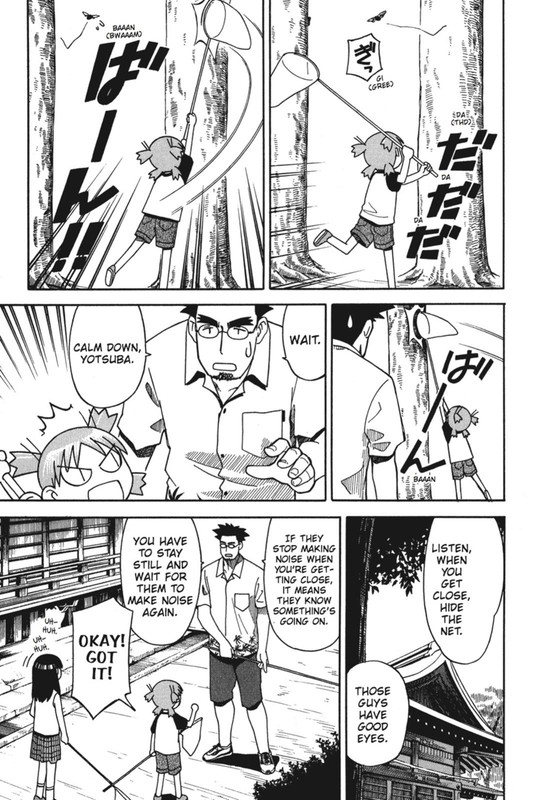 Kvalitet priča zna da varira tokom serijala. Kod Calvina ne postoji neka drastična razlika između prve i poslednje priče, visok kvalitet je sveprisutan kroz ceo serijal što je praktički presedan u svetu stripa, dok kod Yotsube postoji variranja i što serijal duže traje nije toliko originalan kao na početku. Najveća zamerka je što strip previše često zna da se pretvori u turistički vodič kroz Japan. Umesto da se strip bavi idejom, i ima univerzalnu privlačnost, nekada se previše pažnje obraća na neke banalne i previše direktne instrukcije kako se treba ponašati na određenom mestu koje se poseti. Takođe, strip nije dovršen i trenutno je na hiatusu. Poslednjih par tankobončića su dosta lošiji od onih sa početka serijala, a poslednje poglavlje pre hiatusa je neki crossover sa nekim drugim manga serijalom. Po meni potpuno bezveze i nepotrebno.