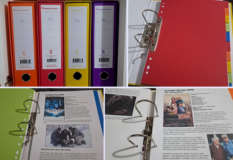 Btw, i dalje poslije svakog filma pišem osvrte, ali više za sebe privatno (za "svoju dušu") i za neku moju arhivu, napišem nakon gledanja analizu i ubacim na papir poster filma, njegove osnovne podatke te koji kadar iz filma, to potom printam na A4 bijeli papir (od 160g da nema preslikvanja na drugu stranu ako je ispis obostrani), te zatim slažem u registar koji označava jednu dekadu (u njemu su oni kartoni u boji koji označavaju godine), evo slike ispod primjerice od 90-ih kako to izgleda. Znam da možda to sve pomalo djeluje blesavo, ali meni osobno baš fora i neki gušt, kao neki popratni hobi. Bude mi zanimljivo kad listam neku godinu i začudim se koliko je u njoj snimljeno sjajnih filmova.